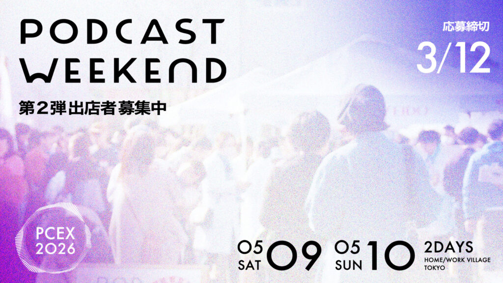 「Podcast Weekend 2026」正式リリースに伴い、第2弾エントリーの受付を開始します。出店を希望されるポッドキャスターの方は、下記エントリーフォームよりお申込みください。